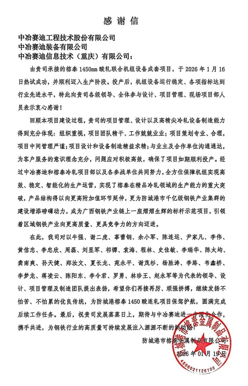 2026年1月19日,中冶賽迪收到來自廣西防城港金屬制品有限公司的感謝信,對中冶賽迪在榕泰1450mm酸軋聯合機組設備成套項目中的卓越表現給予充分肯定,對項目團隊的專業素養與敬業精神致以高度贊譽,字里行間滿含認可與信賴。